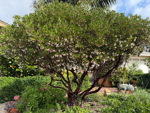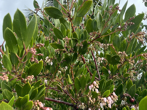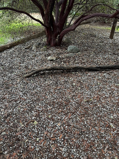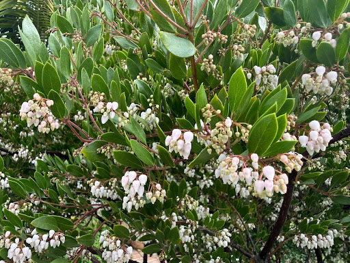 Meanwhile, back at the ranch, a taller manzanita selection, Arctostaphylos manzanita ‘Dr. Hurd’ is blooming and leaving a lovely dusting of “flower snow” at its base.